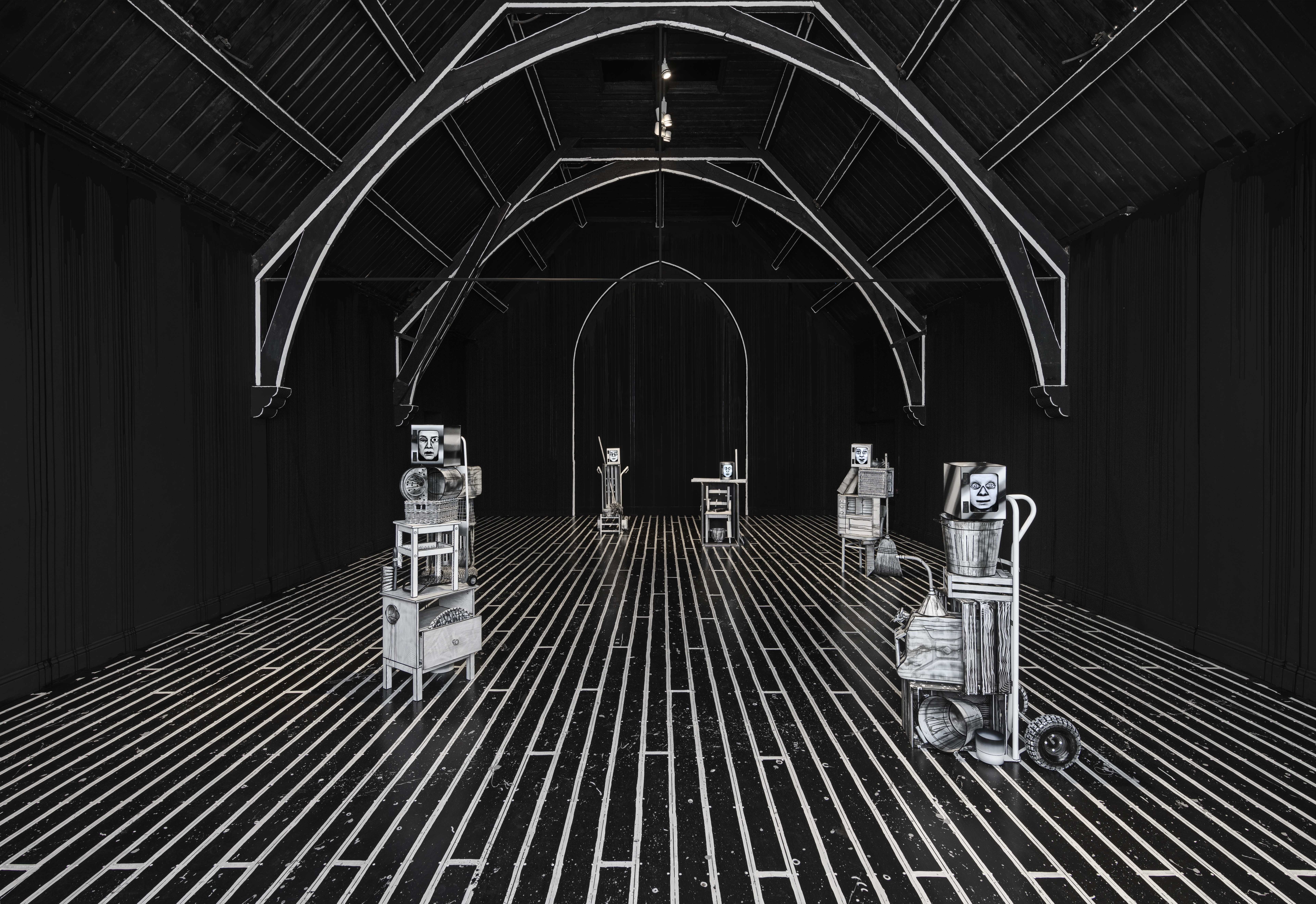 As I enter the Kelleys’ installation Rand/Goop, the culmination of a month-long residency at Studio Voltaire, I feel I’ve wandered onto the set of David Lynch’s Eraserhead (1977)—the experience is more akin to crossing a threshold into a “zone” than casually walking into an exhibition space. The former Methodist church seems to have been passed through a Photoshop filter, rendering it completely in grayscale. The pitched walls are black, while the beams, floorboards, and windows have been outlined and covered in rough washes of white acrylic paint. Six sculptures about the height of a small adult human stand upright, each a precariously balanced assemblage of household objects: a suitcase, a colander, a bedside table. This device of rendering both the human, on-screen characters and the physical objects in the room in janky black-and-white outlines grounds the activity in another dimension. Here is a transportive place between the dead and the living, where humans are flattened, becoming grotesquely cartoonish. The piles of dead objects, on the other hand, seem elevated by this treatment, taking on lives of their own.